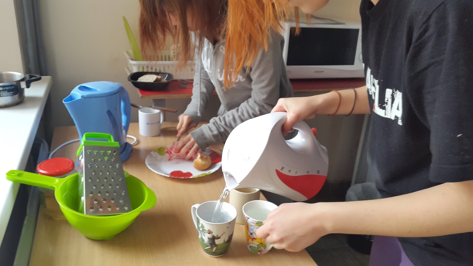 We arrived at the dorm, and the girls cooked some spaghetti. Oh Murilo cooked the fish fingers that we bought earlier, then we ate our dinner together.